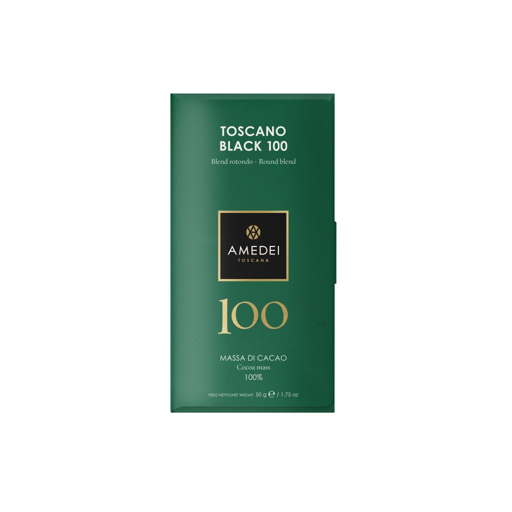 Toscano Black 100 je guľatou zmesou charakterizovanou jemnou kyslosťou vyváženou sekundárnymi arómami, tónmi a nuansami, odhaľujúcimi elegantnú chuť a čistotu výberových kakaových bôbov. Pretrvávajúca chuť tejto kakaovej hmoty, získaná dômyselným spojením bôbov z Ghany, Madagaskaru, Ekvádoru a Grenady, zanecháva poschodie čisté a úplne spokojné. Nula horkosti, vyváženosť a dokonalá lahodnosť, ktoré nedosahujú ani mnohé 70% čokolády je absolútny triumf tohto výtvoru. Pomer odrôd tohto blendu 4 typov single origin bôbov v tabuľke je potom 60% trinitario a 40% forastero.
