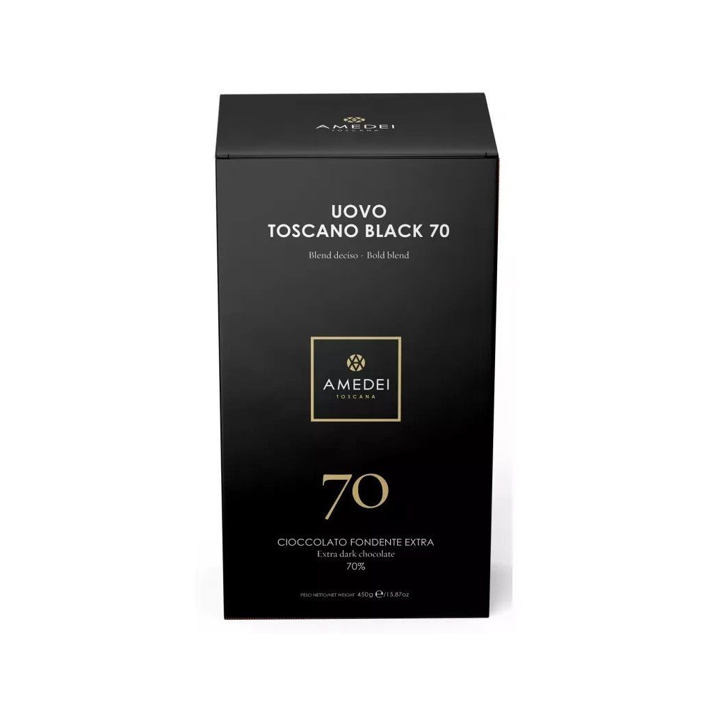 70 % tmavá čokoláda Toscano Black Amedei je úplne prvou čokoládou z ich výroby a vlajkovou loďou, od ktorej sa kedysi všetko začalo.S tónmi tabaku, praženého sladu a cédrového dreva je veľmi delikátnou voľbou všetkých gurmánov. Vzniká zo zmesi kakaa trinitario a criollo a ponúka 70 % plných emócií. Bohatá, trvalá, krémová. Vďaka tomuto percentu je to univerzálna kakaová delikatesa.Práve z tejto prémiovej čokolády je vyrobené toto buď 80 g, alebo takmer polkilové (podľa varianty produktu) obrovské veľkonočné vajce v darčekovej krabičke s pralinkami vnútri. Ide o limitovanú edíciu na Veľkú noc 2023. Originálny a krásny ručne vyrobený darček na sviatky pre milovníkov kvalitnej čokolády.