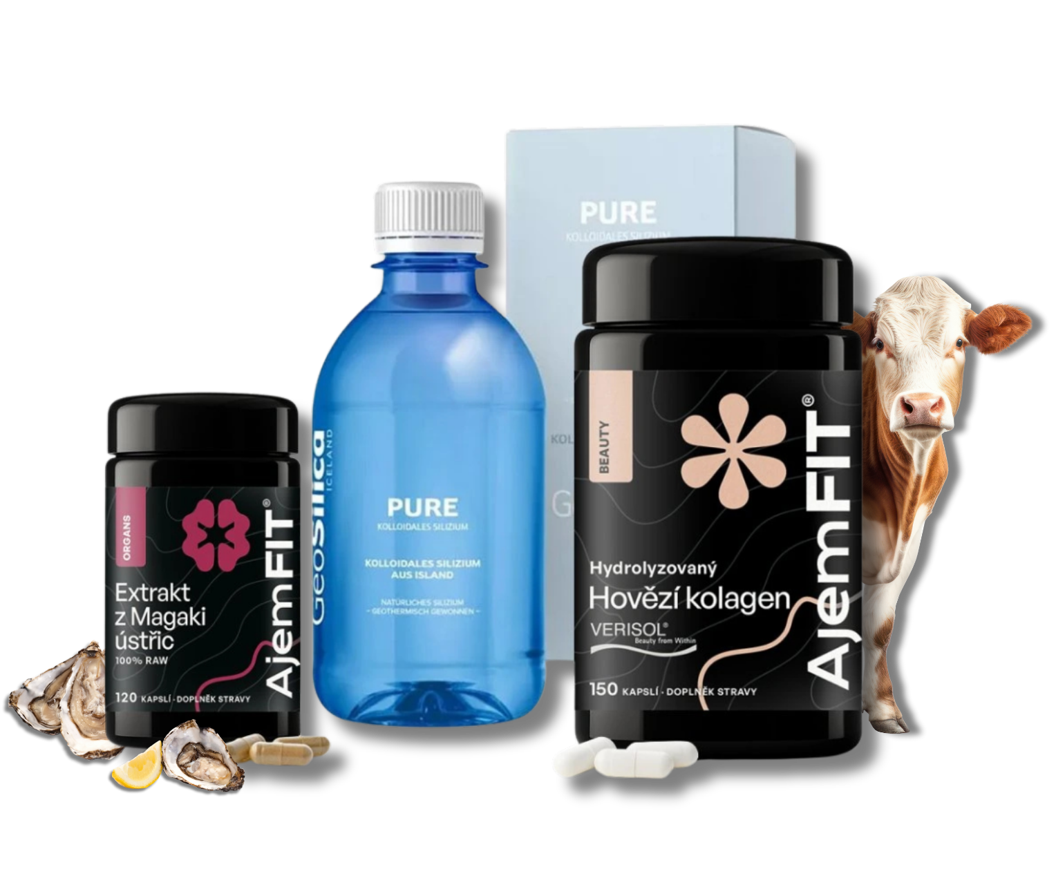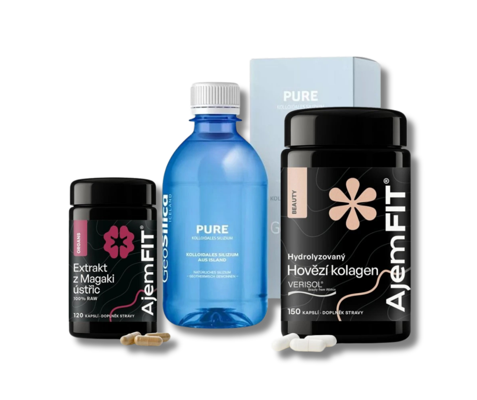 Balenie: Extrakt z ustríc Magaki (120 kapsúl) + Geosilica Pure (300 ml) + Kolagén Verisol® (podľa varianty) · cca 30-60 dávok (na 30-60 dní)