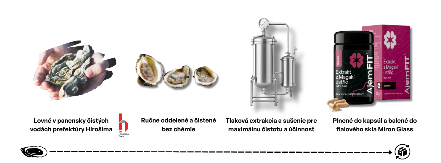 Všetko začína lovom v naprosto čistých vodách prefektúry Hirošima v Japonsku, kde sú ustrice chránené pred znečistením a majú vyhlásenú kvalitu. Po vylovení je každý kus starostlivo a ručne oddelený a očistený, bez použitia akejkoľvek chémie – aby si ustrice zachovali svoje pôvodné zloženie aj prírodnú čistosť. Potom nasleduje tlaková extrakcia a sušenie, ktorá garantuje maximálne zachovanie účinných minerálov, vitamínov aj bioaktívnych látok. Výsledný extrakt sa plní do kapsúl a bezprostredne balí do fialového skla Miron Glass, ktoré chráni každú dávku pred svetlom a vlhkosťou a zachováva čerstvosť až do poslednej kapsuly.
