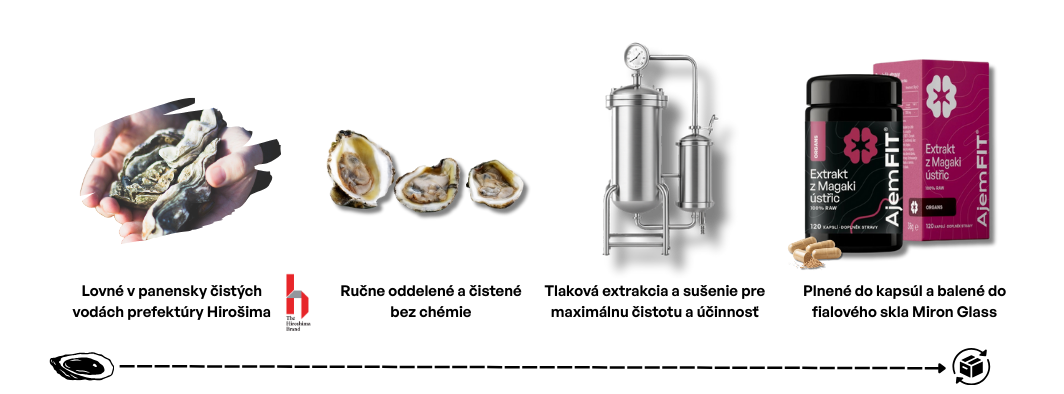 Všetko začína lovom v naprosto čistých vodách prefektúry Hirošima v Japonsku, kde sú ustrice chránené pred znečistením a majú vyhlásenú kvalitu. Po vylovení je každý kus starostlivo a ručne oddelený a očistený, bez použitia akejkoľvek chémie – aby si ustrice zachovali svoje pôvodné zloženie aj prírodnú čistotu. Potom nasleduje tlaková extrakcia a sušenie, ktorá garantuje maximálne zachovanie účinných minerálov, vitamínov aj bioaktívnych látok. Výsledný extrakt sa plní do kapsúl a bezprostredne balí do fialového skla Miron Glass, ktoré chráni každú dávku pred svetlom a vlhkosťou a zachováva čerstvosť až do poslednej kapsuly.