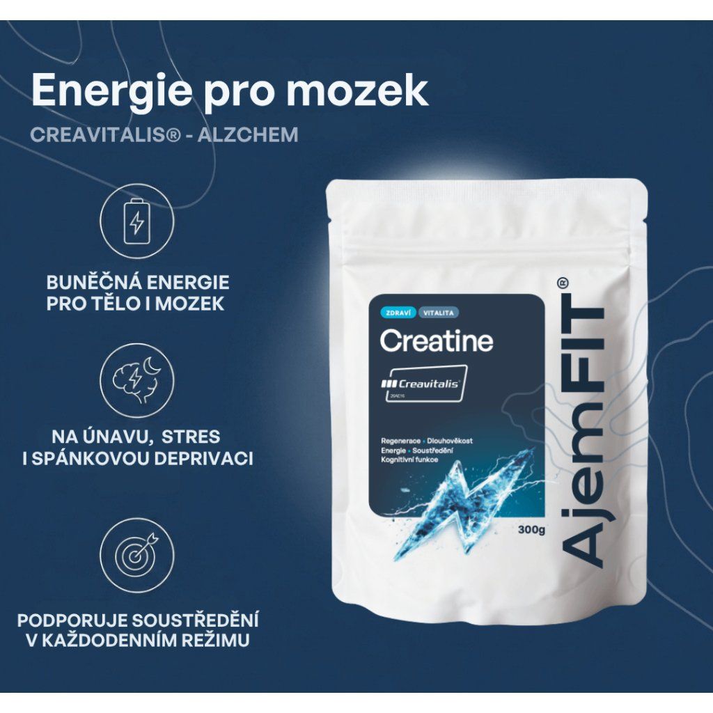 AjemFIT Creatine obsahuje Creavitalis® — kreatín od nemeckej firmy AlzChem. Čistota 99,9 %, k každej výrobnej šarži certifikát analýzy. Balenie 150 g (30 dávok) alebo 300 g (60 dávok) v praktickom doypacku.