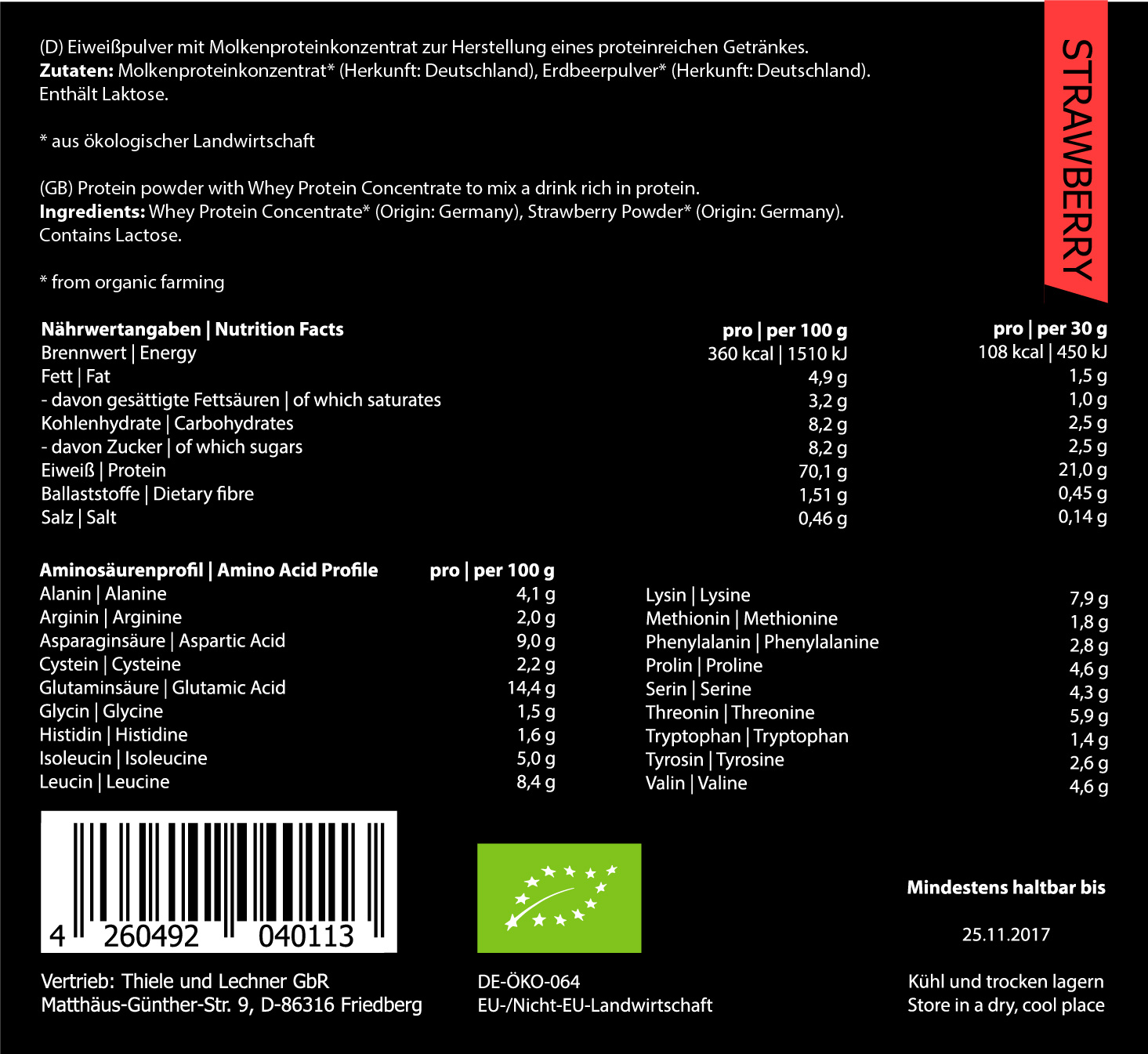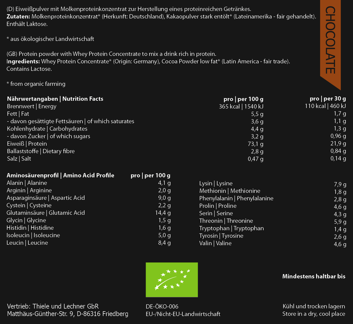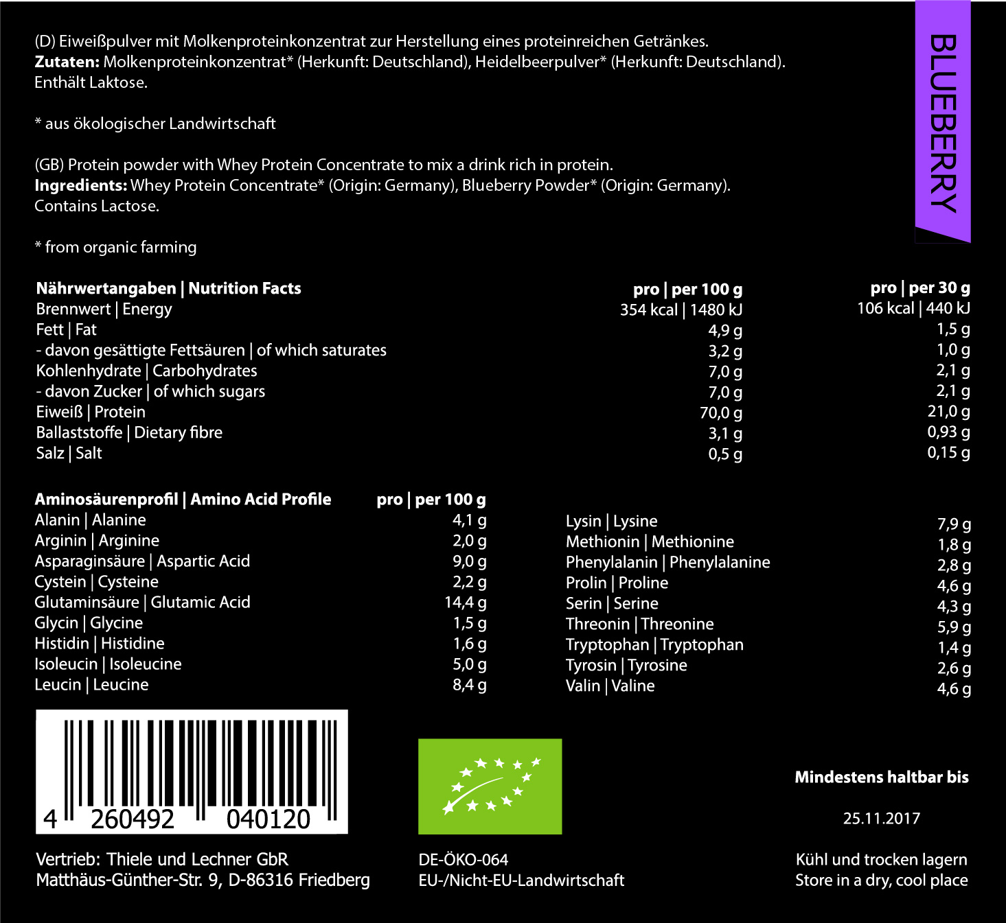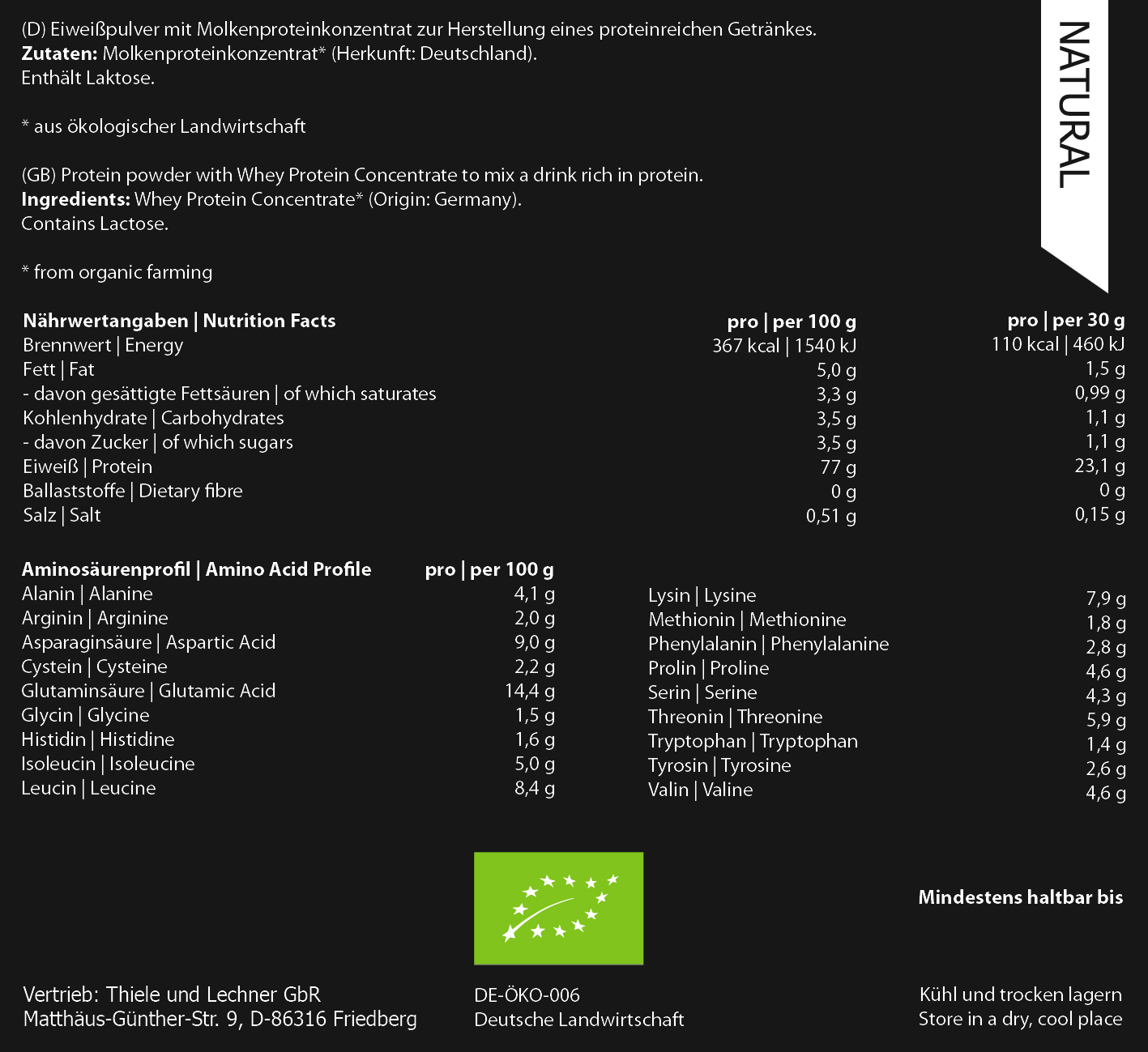 Nutričné hodnoty v 100g : Energia 1540kJ/367kcal ,Tuky 5g z toho saturované 3,3g ,Uhlohydráty 3,5g z toho jednoduchý cukor 3,5g ,Bielkoviny 77g ,Soľ 0,51g Nutričné hodnoty sú založené na príchuti Natural a u iných príchutí sa môžu mierne líšiť. Zloženie: Bio koncentrát srvátkovej bielkoviny*, Bio odtučnený kakaový prášok* (len príchuť Kakao), Bio vanilkový prášok z Tahiti*(len príchuť Vanilka), Bio čučoriedkový prášok*(len príchuť čučoriedka), Bio jahodový prášok*(len príchuť Jahoda). *Certifikované Bio suroviny z ekologického poľnohospodárstva