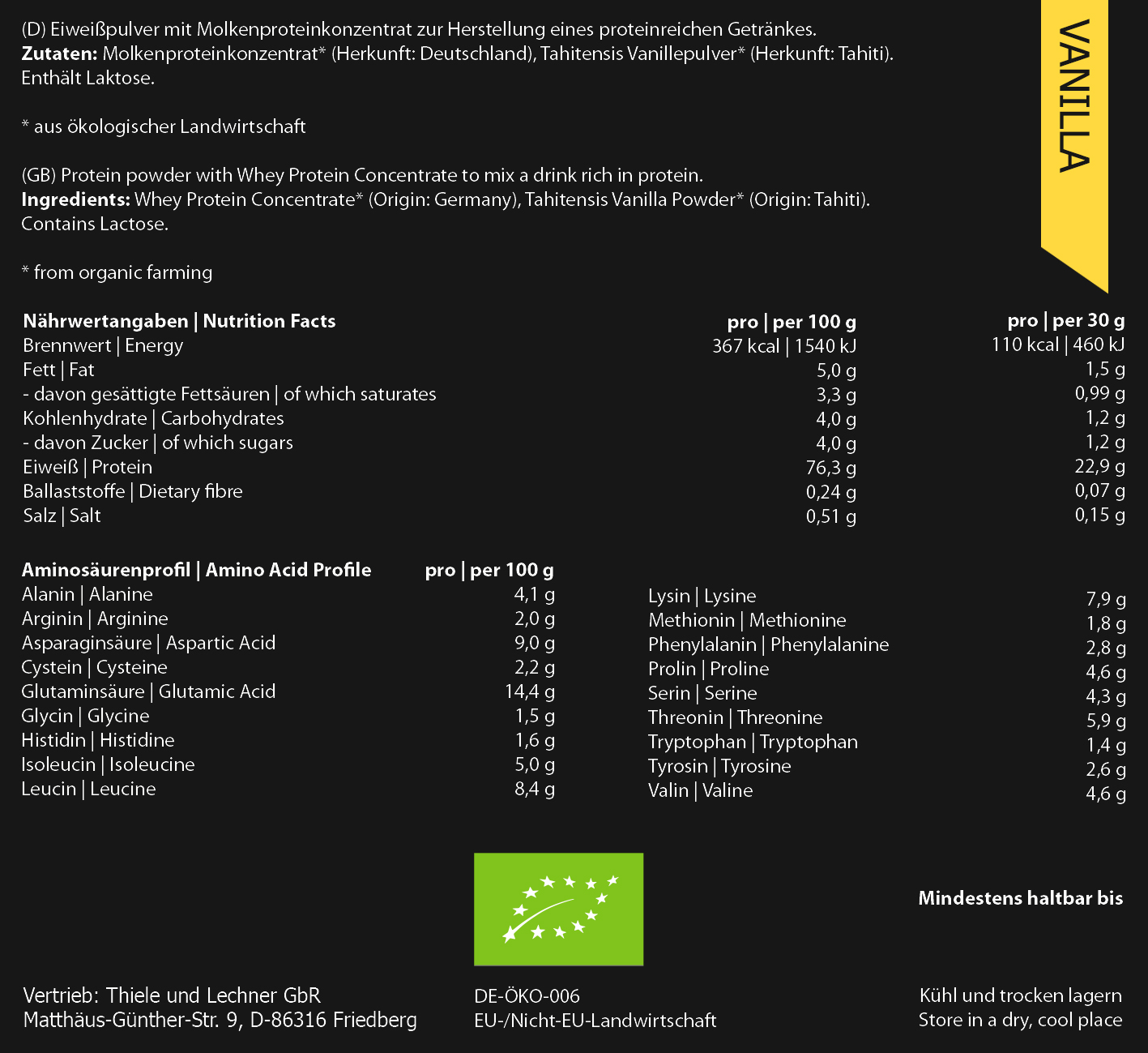 - Zloženie: BIO grass fed koncentrát srvátkovej bielkoviny, BIO Bourbon vanilkový prášok z Tahiti