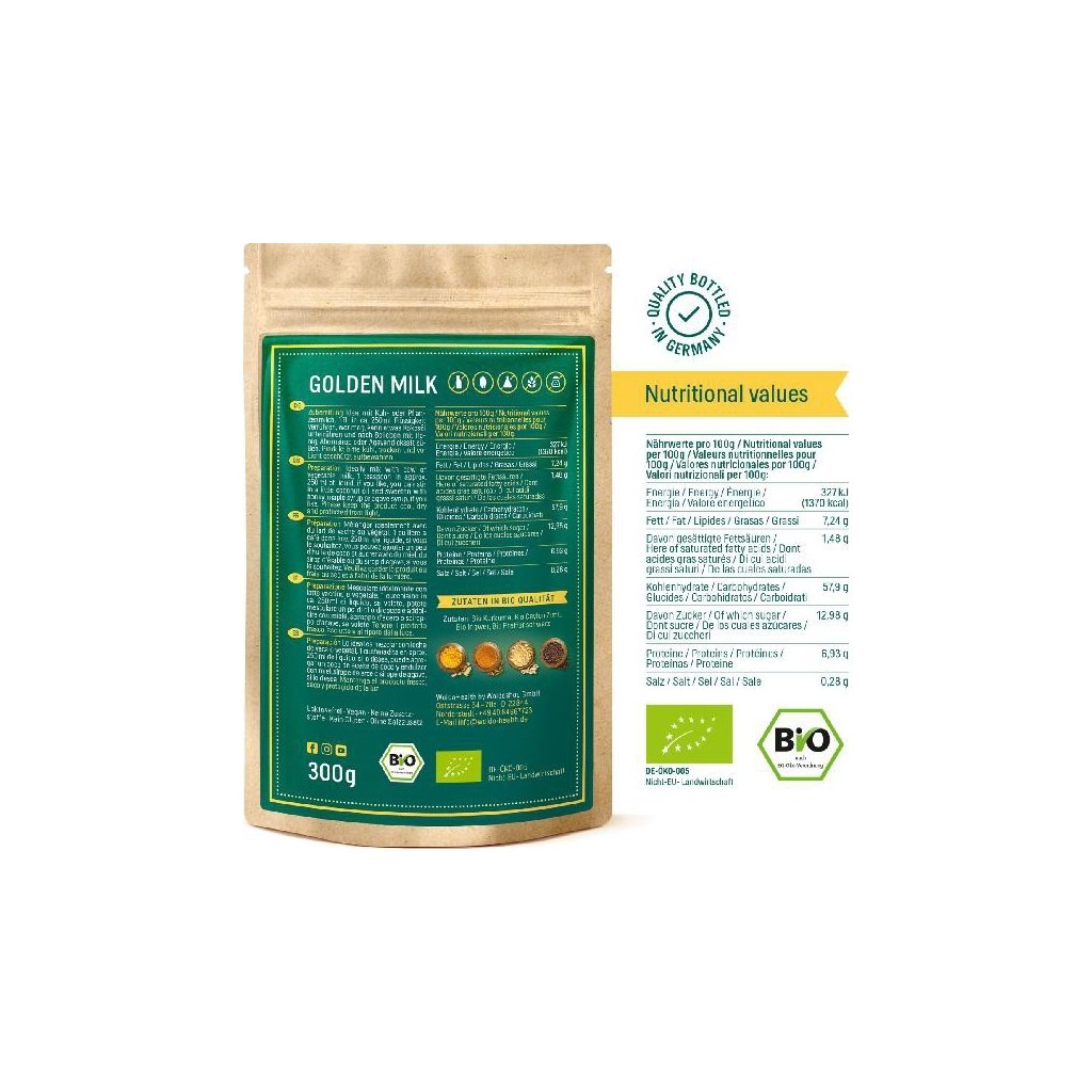 Je tiež vhodný pre vegánov a vegetariánov. Pravidelná konzumácia zlatého mlieka má mnoho priaznivých vplyvov na ľudské telo. Posilňuje imunitný systém, napomáha k zlepšeniu funkcie žalúdka a čriev, čistí krv od toxínov a zmierňuje príznaky stresu, nespavosti a bolesti hlavy. Taktiež môže regulovať hladinu cholesterolu a detoxikovať pečeň. Produkt neobsahuje žiadne aditíva, akými sú laktóza, lepok alebo soľ. Všetky suroviny sú v bio kvalite pochádzajúce z ekologického poľnohospodárstva. Je dodávaný v nepriehľadnom uzatvárateľnom obale, ktorý chráni produkt pred UV žiarením a udržuje optimálnu trvanlivosť.