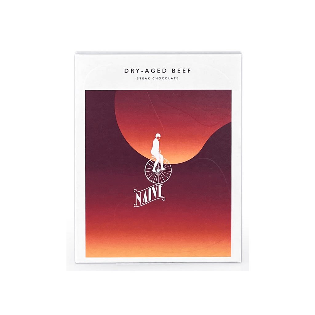 Prekvapivá kombinácia chutí robí z DRY-AGED BEEF unikátnu vysokopercentnú darkmilk čokoládu, ideálnu pre milovníkov mäsa, korenia a netradičných chutí. Ako všetky čokolády z kolekcie Forager od Naive, aj táto tabuľka čerpá z miestnych surovín Litvy (med, ambrozia, kefír, hríby, mlieko, mäso, maslo, brusnice...). Samotný zakladateľ Domantas Užpalis často zbiera divoké hríbiky z litovskej prírody alebo navštevuje miestne farmy, aby zaistil čerstvé suroviny pre svoje čokolády.