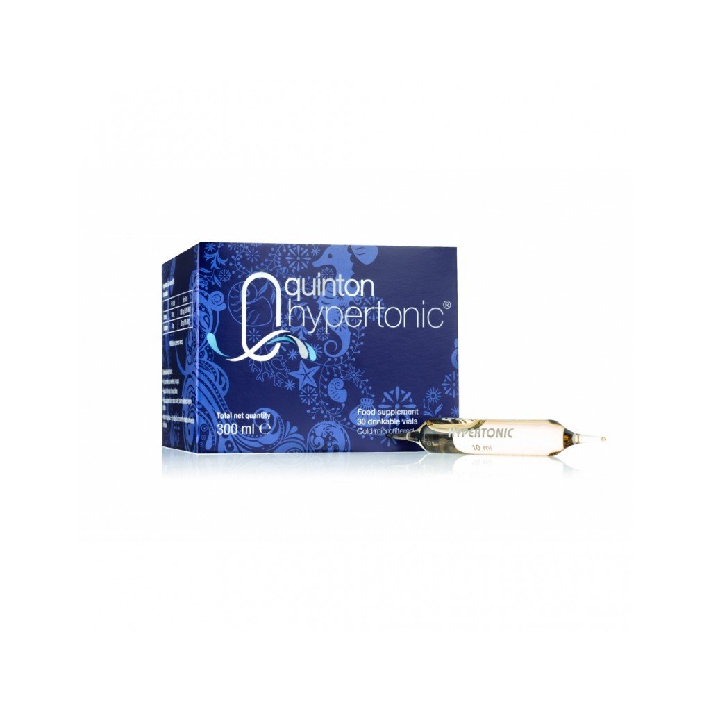 Zloženie:Quinton Hypertonic je prírodná čerstvá morská voda z planktónových oblastí spracovaná studenou mikrofiltráciou podľa originálneho postupu René Quintona, Bakteriologicky čistá, prirodzene sterilná (26.22 <26,5 Ro Ohms/cm2/cm 45000.). Nie je tepelne ani chemicky upravovaná.