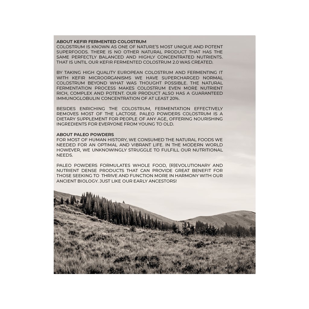 Kefír je považovaný za kráľa fermentovaných potravín nielen preto, že robí mliečne výrobky stráviteľnejšími, ale aj preto, že ponúka bezkonkurenčnú komplexnosť zloženia a nutričnú hustotu. Z týchto dôvodov sme v PALEO POWDERS prevzali koncept kefíru a aplikovali ho na naše bovinné kolostrum: najzákladnejšiu formu potravy.