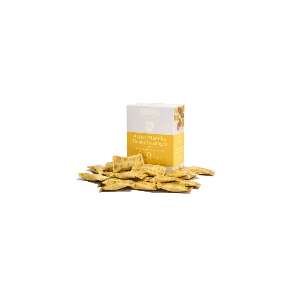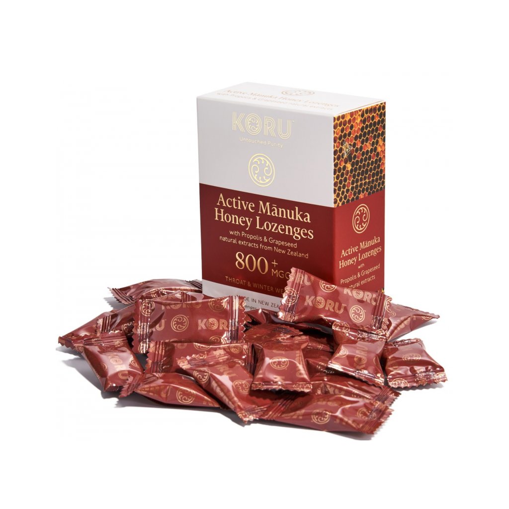 Prírodné medové pastilky od KORU obsahujú extra silný, veľmi kvalitný surový med Mānuka s certifikovaným hodnotením MGO 800+ z pár najzachovalejších a najvzdialenejších miest Nového Zélandu. KORU prémiový med Mānuka je pozberaný, testovaný a certifikovaný na Novom Zélande, aby bola zaručená top kvalita a autentickosť.