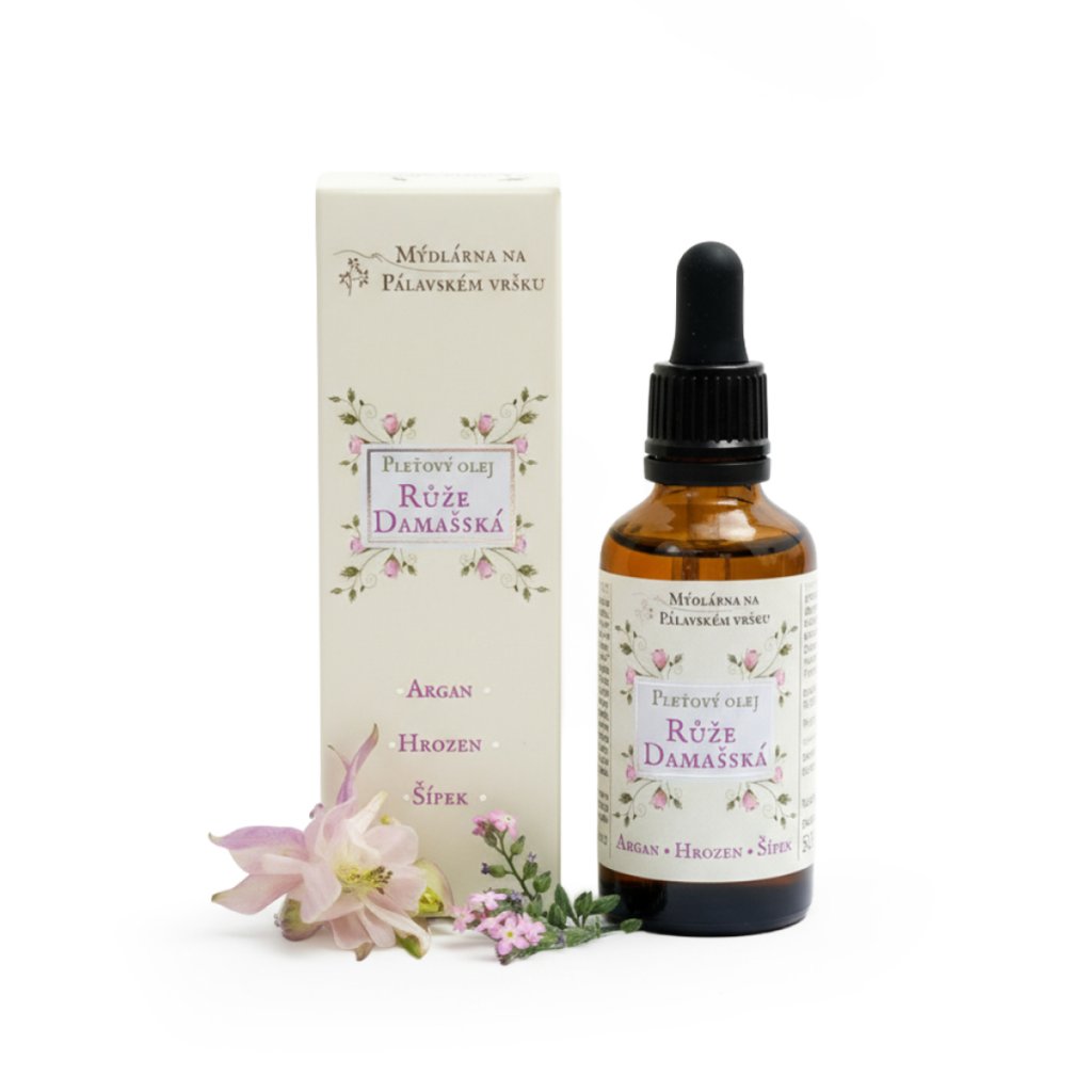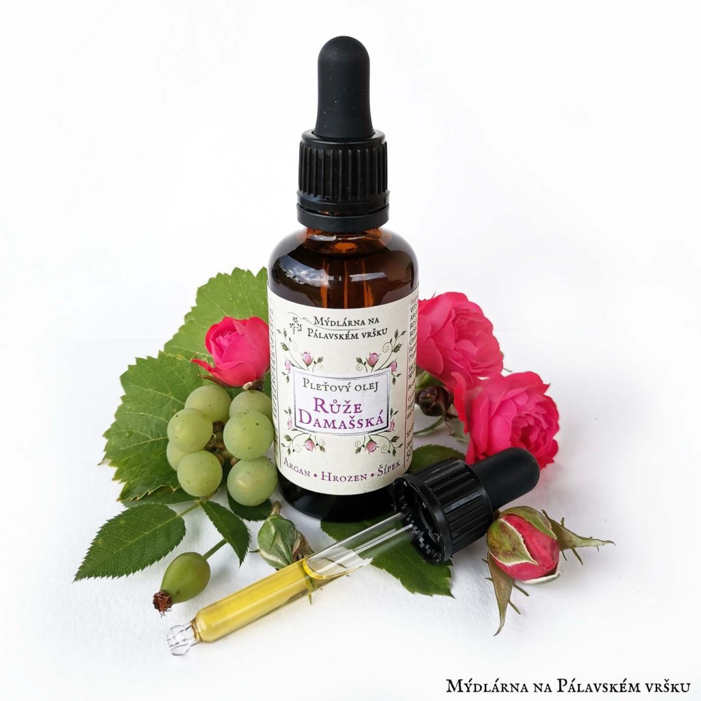 Prírodný pleťový olej RUŽA DAMAŠSKÁ s opojnou vôňou 100% esenciálneho oleja Ruže damašskej prináša luxusnú starostlivosť pre normálnu aj zrelú pleť.