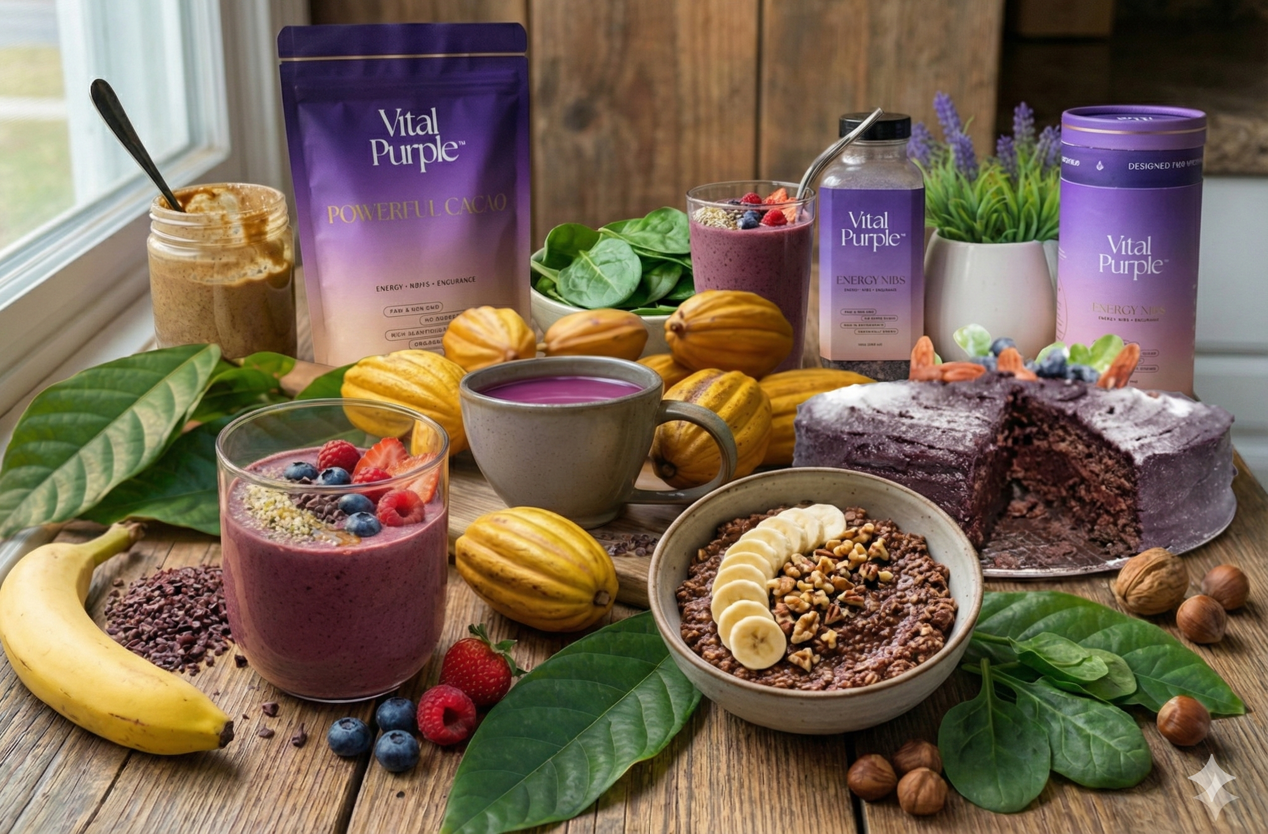 NEUROAKTÍVNE LÁTKY: VITAL PURPLE obsahuje jedinečný kokteil prírodných chemických látok pôsobiacich na myseľ, ktoré katalyzujú uvoľňovanie serotonínu, dopamínu a endorfínov v mozgu. Neuroaktívne chemické látky kakaa dosahujú vrchol v krvi 2–3 hodiny po požití a majú polčas rozpadu až 7–12 hodín. Chemické zloženie kakaa z neho robí úžasný prírodný zdroj endokanabinoidov (anandamid/n-arachidonoylethanolamín a zlúčeniny štrukturálne podobné endokanabinoidom), opiátov a stimulantov (alkaloidov). Slovo anandamid pochádza zo sanskrtu z „Ānanda“, čiže „blaženosť“. Ako neurotransmiter je anandamid prekurzorom euforických pocitov a dobrej nálady. „Terapeutická dávka týchto chemických látok môže zmeniť chémiu mozgu a vyvolať eufóriu.“