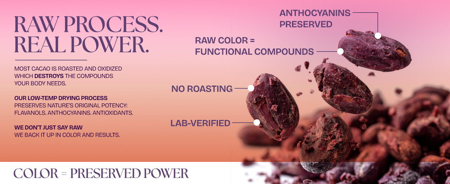Prírodná kombinácia živín a farby existuje vo VITAL PURPLE len preto, že je skutočne surová, s teplotou spracovania úplne pod 32 °C. Úmyselne sme vylúčili proces fermentácie a praženia, aby sme napodobnili zdravotné prínosy konzumácie čistého kakaa priamo zo struku počas zberu. Väčšina „surových“ kakaových produktov stále prechádza fermentáciou až do teploty 59 °C, čo ničí životne dôležité živiny a spôsobuje hnednutie/oxidáciu. Pri výrobe Vital Purple strácame len časť tuku, ale obsah zostáva stále vysoký v porovnaní s konvenčným kakaom (25 % oproti bežným 10–12 %).