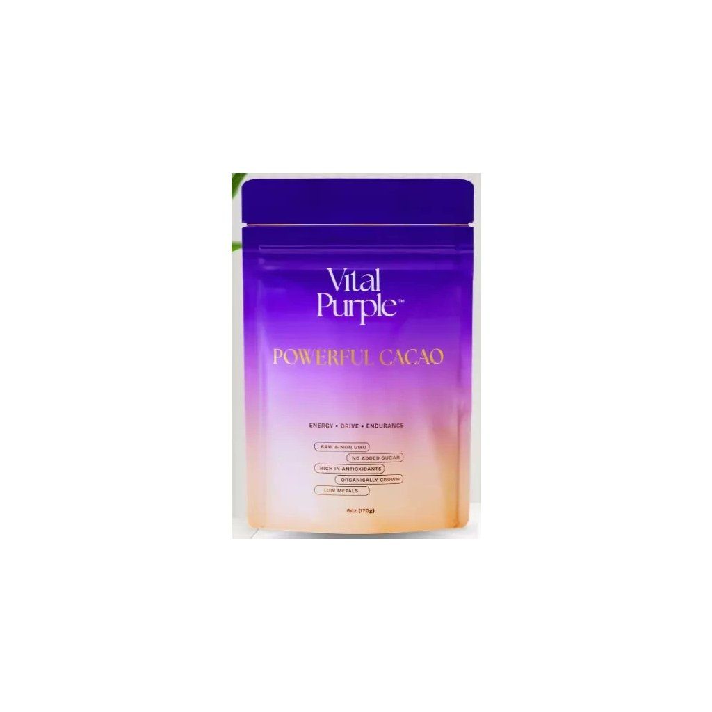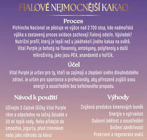 Pravé surové fialové kakao je najsilnejšia bioaktívna forma kakaa. Vital purple je testované na veľmi nízky obsah ťažkých kovov (hlboko pod limitmi EÚ) a zároveň na najvyšší obsah flavanolov zo všetkých potravín (750–900 mg flavanolov na dávku!).100 % prírodný surový produkt z horského pestovania bez pesticídov a umelých chemikálií. Spracované pri teplote do 32 °C. Bez GMO a prísad.