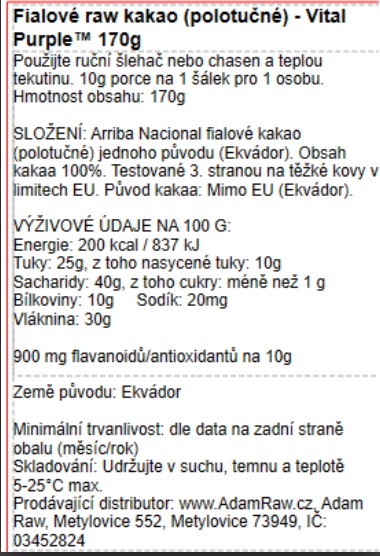 Navyše a hlavne – takmer všetko kakao/čokoláda na trhu, ktoré má v názve RAW, nie je skutočne surové, v 99,9 % ide o klamanie spotrebiteľa a neposkytuje ani bioaktívny účinok, ani zloženie látok či chuť pravého surového fialového kakaa. Pod značkou Naive Chocolate už 6 rokov distribuujeme jedinú a prvú čokoládu na trhu z fialových bôbov, spracovanú pri najnižších teplotách (https://www.adamraw.cz/purple-naive/), avšak kakao VITAL PURPLE vo forme prášku na prípravu nápojov alebo do receptov je novou 100 % formou pre mnohostranné využitie.