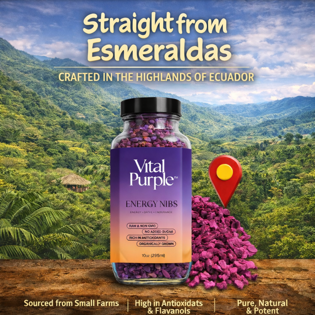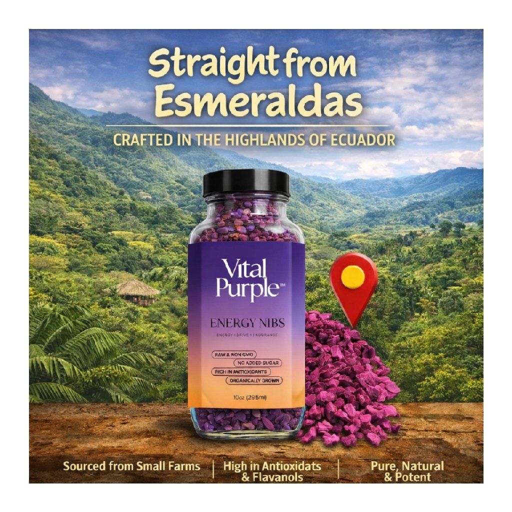 Prírodná kombinácia živín a farby existuje vo VITAL PURPLE len preto, že je skutočne surová, s teplotou spracovania úplne pod 32 °C. Úmyselne sme vylúčili proces fermentácie a praženia, aby sme napodobnili zdravotné prínosy konzumácie čistého kakaa priamo zo struku počas zberu. Väčšina „surových“ kakaových produktov stále prechádza fermentáciou až do teploty 59 °C, čo ničí životne dôležité živiny a spôsobuje hnednutie/oxidáciu. Pri výrobe Vital Purple strácame len časť tuku, ale obsah zostáva stále vysoký v porovnaní s konvenčným kakaom (25 % oproti bežným 10–12 %).