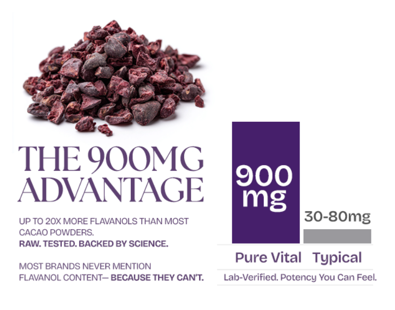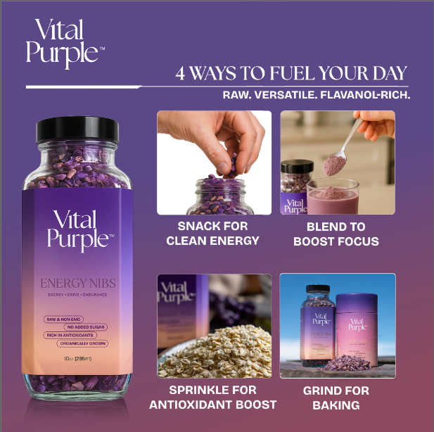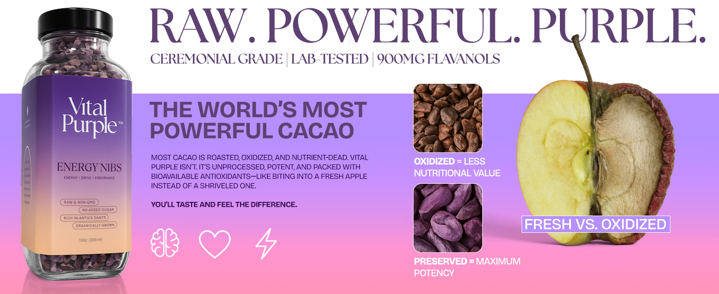 Pravé surové fialové kakao je najsilnejšia bioaktívna forma kakaa. Vital purple je testované na veľmi nízky obsah ťažkých kovov (hlboko pod limitmi EÚ) a zároveň na najvyšší obsah flavanolov zo všetkých potravín (900 mg flavanolov na dávku!).100 % prírodný surový produkt z horského pestovania bez pesticídov a umelých chemikálií. Spracované pri teplote do 32 °C. Bez GMO a prísad.