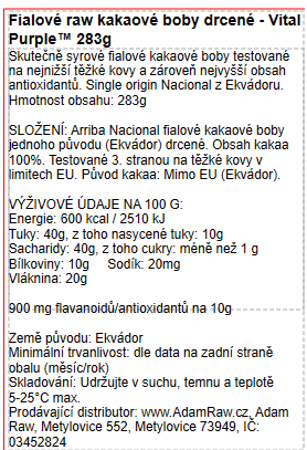 Navyše a hlavne – takmer všetko kakao/čokoláda na trhu, ktoré má v názve RAW, nie je skutočne surové, v 99,9 % ide o klamanie spotrebiteľa a neposkytuje ani bioaktívny účinok, ani zloženie látok či chuť pravého surového fialového kakaa. Pod značkou Naive Chocolate už 6 rokov distribuujeme jedinú a prvú čokoládu na trhu z fialových bôbov, spracovanú pri najnižších teplotách (https://www.adamraw.cz/purple-naive/), avšak kakao VITAL PURPLE vo forme drvených bôbov je novou 100 % formou pre mnohostranné využitie.