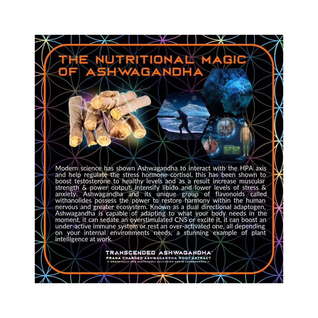 Výživový doplnok. Transcended Ashwagandha je najkvalitnejší a pránicky nabitý extrakt z plnospektrálneho koreňa Indickej ashwagandhy. Iba prvotriedna KSM-66® Ashwagandha, mnohonásobne oceňovaný bylinný extrakt s ochrannou známkou, ktorý je všeobecne uznávaný ako „najlepšia Ashwagandha na svete“. Jediný extrakt z Ashwagandhy na svete, ktorý je navyše pránicky nabitý najmodernejším generátorom kvantovej orgónovej energie na 432 Hz a uložený v prémiovom fialovom mironovom skle.