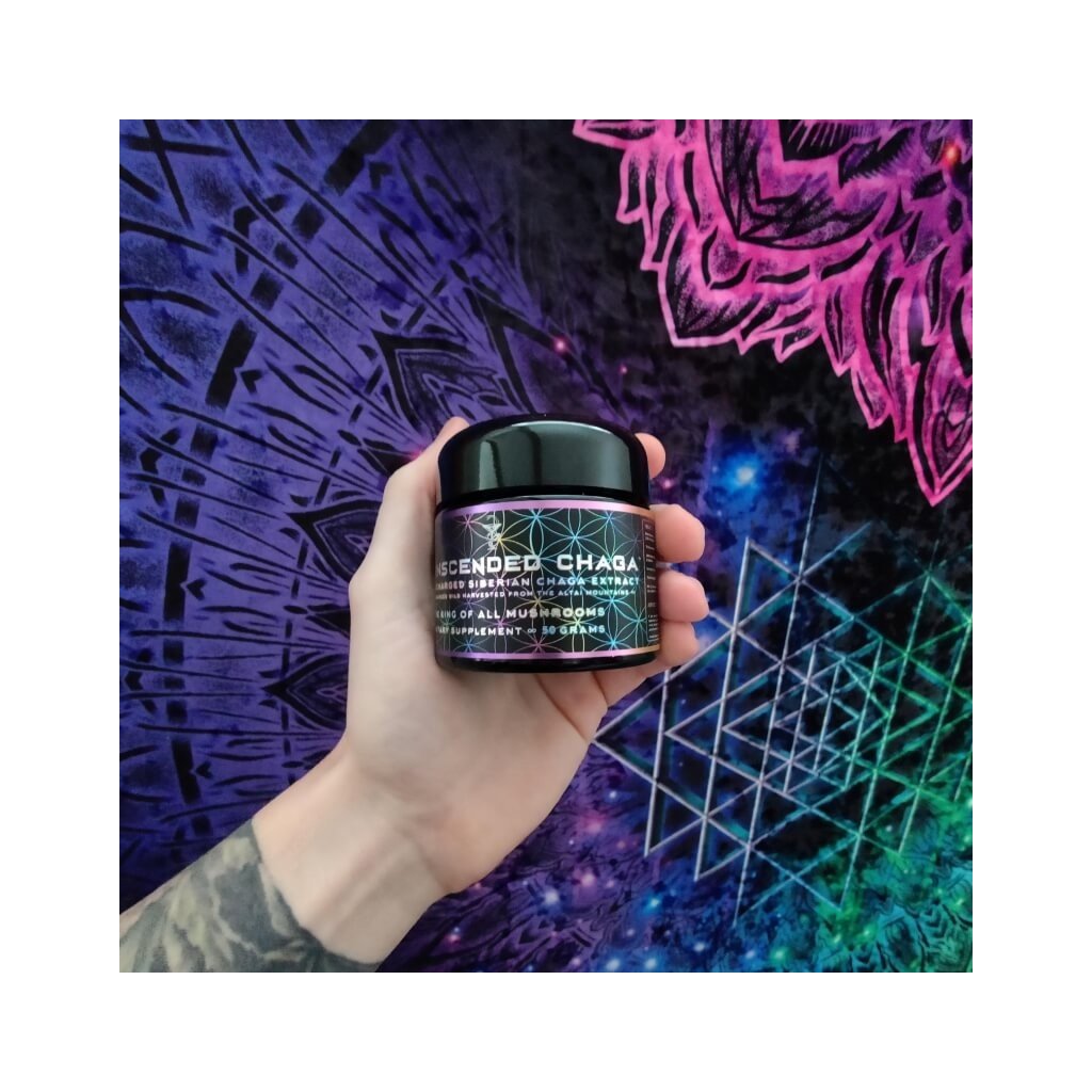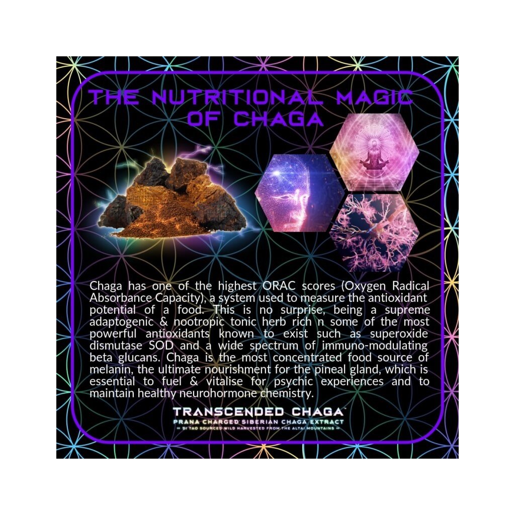 Výživový doplnok. Transcended Chaga je silný koncentrovaný tonický prášok z 12:1 hubového extraktu pránicky nabitej Sibírskej brezovej Chagy. Jediný výťažok z chagy na svete, ktorý je navyše pránicky nabitý najmodernejším generátorom kvantovej orgónovej energie na 432 Hz a uložený v prémiovom fialovom mironovom skle.