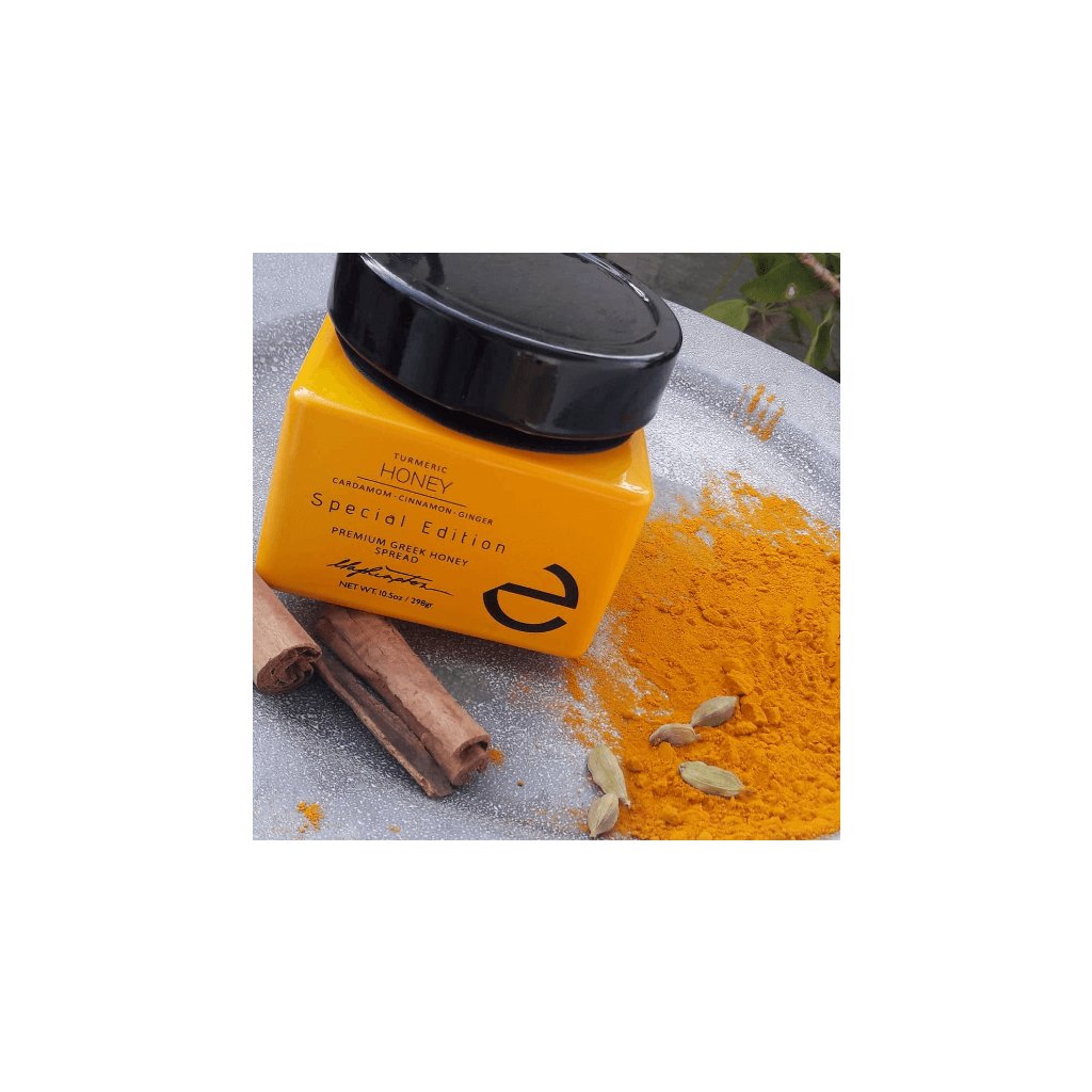 Zloženie: Raw grécky med (nepasterizovaný, nefiltrovaný) 98,8%, kurkuma 0,5%, škorica 0,5%, zázvor 0,1%, kardamóm 0,1%. Surový med - Nie je vhodné pre dojčatá do 1 roka.